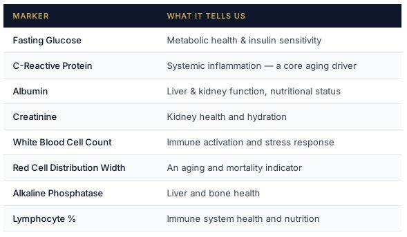We calculate your biological age — the age your body is actually functioning at — using validated blood biomarkers. This number can differ significantly from your calendar age and is directly actionable.